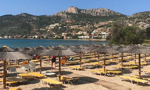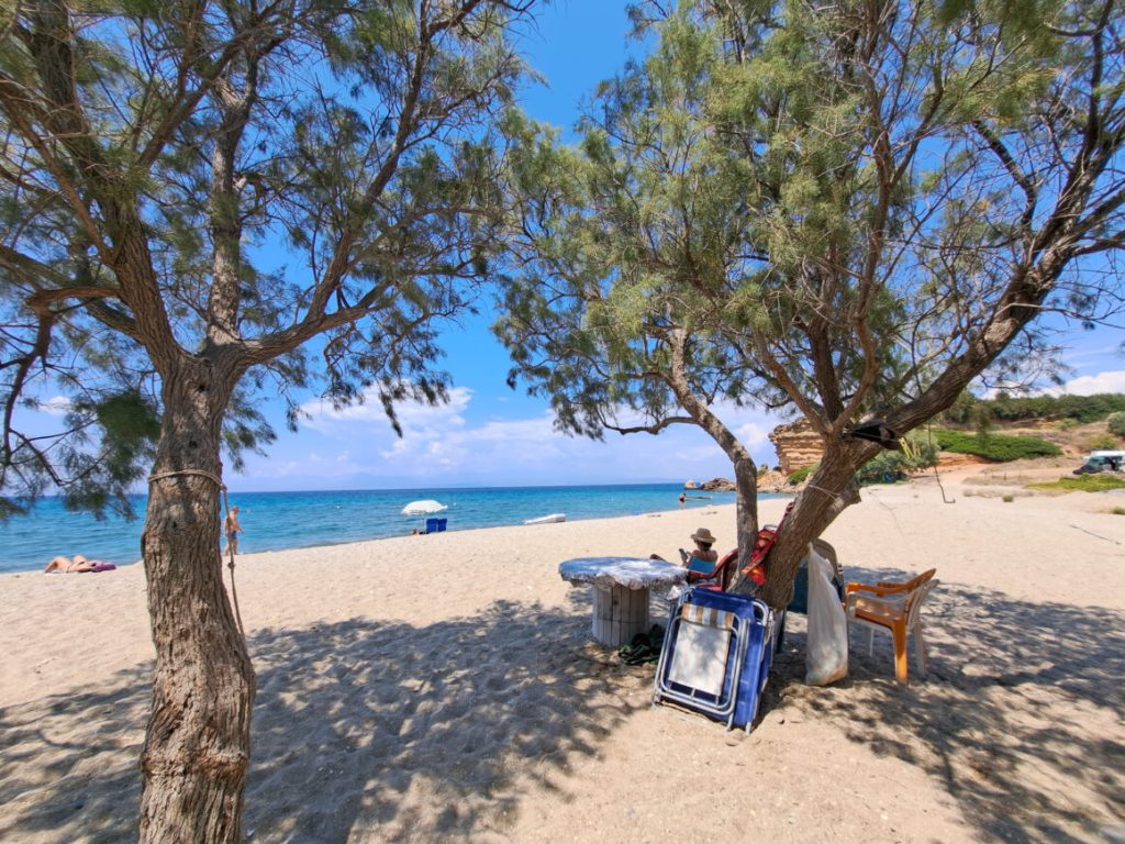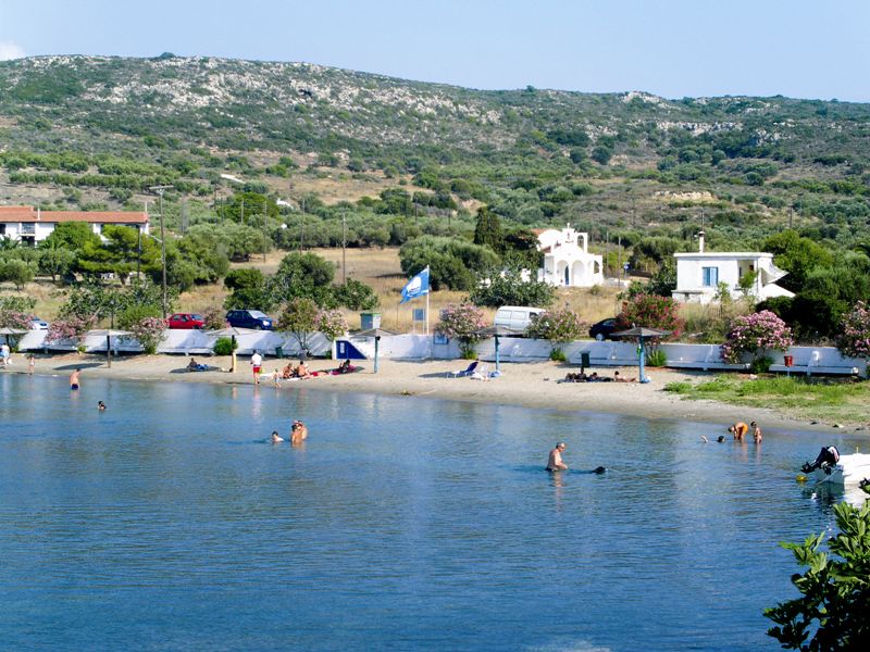 The cosmopolitan beach that is popular and known for its sandy beach and shallow waters. With many choices of food, coffee and ice cream. It has been awarded the blue flag and there is a life-guard present. You will find this beach in the village of Plitra where you will find many different choices for restaurants and tourist shops that are open mostly in the summer months. The beach is organized with sunbeds and umbrellas.